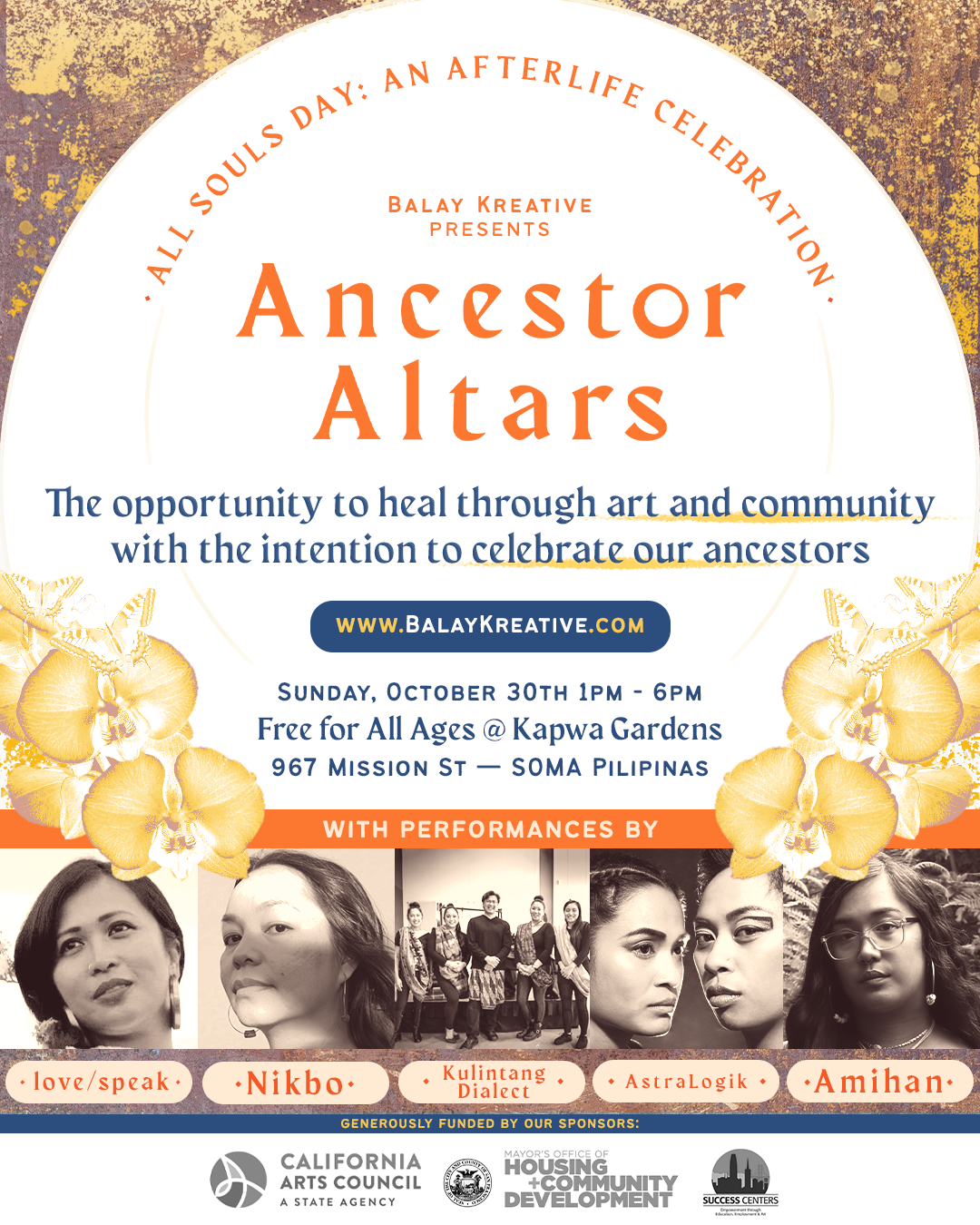 The “Ancestor Altars” installation art project at Kapwa Gardens will be a healing space for the San Francisco Filipinx & BIPOC community. This All Souls Day brings the opportunity to heal through art and community with the intention to celebrate our ancestors, share the stories we learned from them, and show gratitude with love and respect. Join us this October for an afterlife celebration as we listen to live musical performances, reflect together as a community and remember our loved ones.