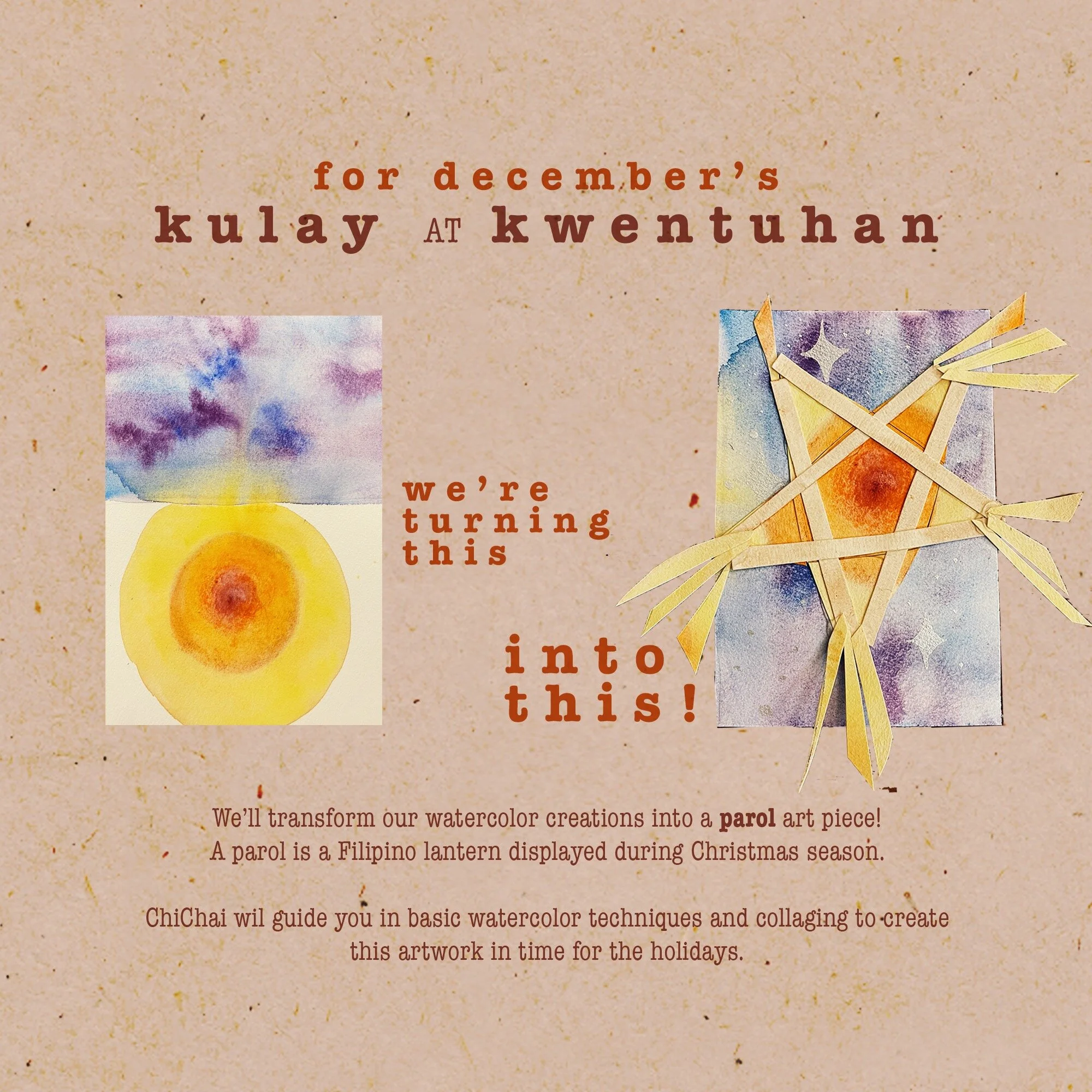 For this month’s session we’ll transform our watercolor creations into a parol art piece! A parol is a Filipino lantern displayed during Christmas season. ChiChai will guide you in basic watercolor techniques and collaging to create this artwork in time for the holidays.