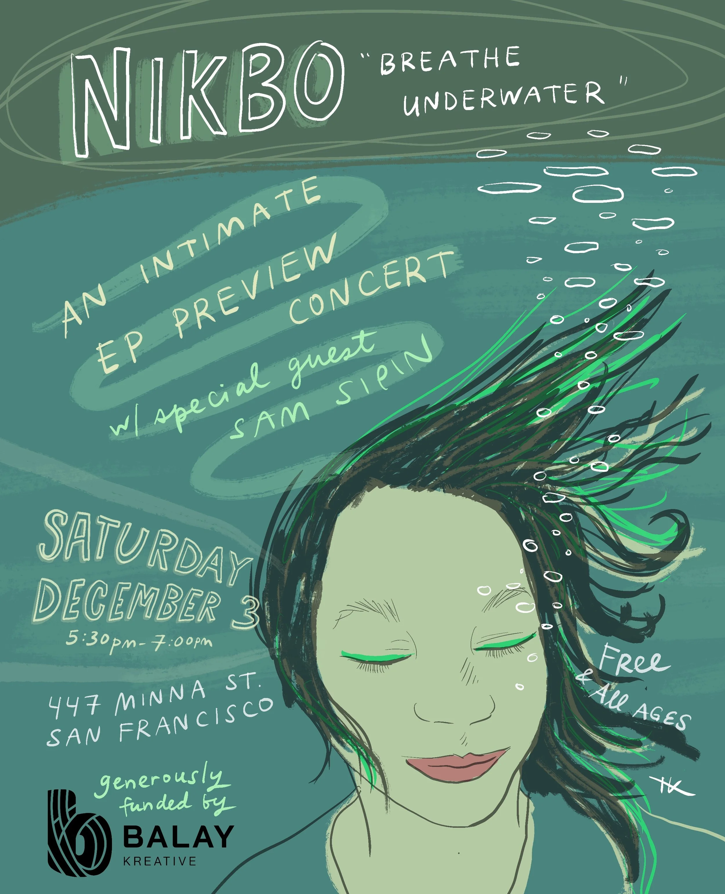 “Breathe Underwater” is a collection of songs born out of pandemic grief and deep love for family across borders and timezones. After several family members passed away in 2021, Nikbo began to withdraw from music. A writing workshop called “Mapping the Wilds of Grief” led by Katrina Goldsaito helped Nikbo reconnect to creativity as a healing practice. The workshop inspired Nikbo to launch an oral history project, documenting stories and writing songs in collaboration with family abroad. At this special event, made possible by the Balay Kreative Growth Grant, Nikbo will debut new music inspired by loved ones and ancestors.