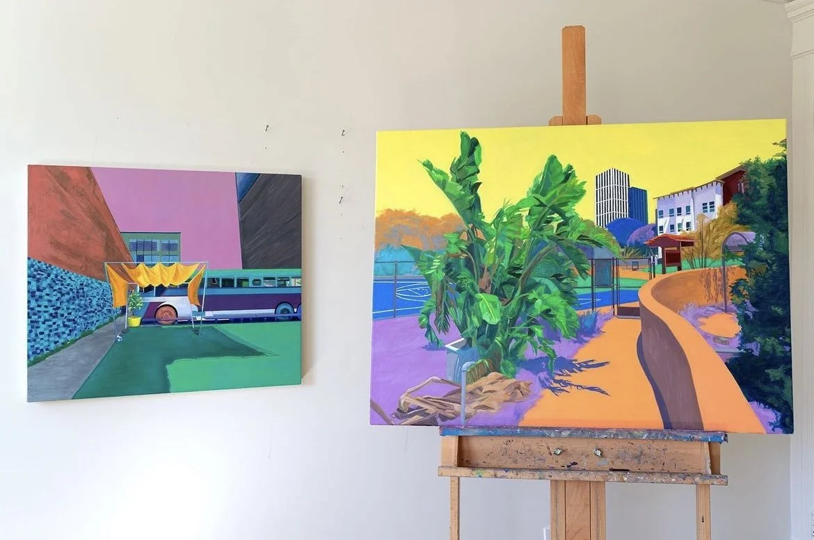 I’m creating six paintings for this upcoming exhibition, and I’m approaching it as a residency in SOMA. I’m limiting myself to the places and sights here in SOMA. Through parks and public spaces, I reflect upon the history and continued presence here of the Filipinx community here in the SOMA Pilipinas Cultural District.