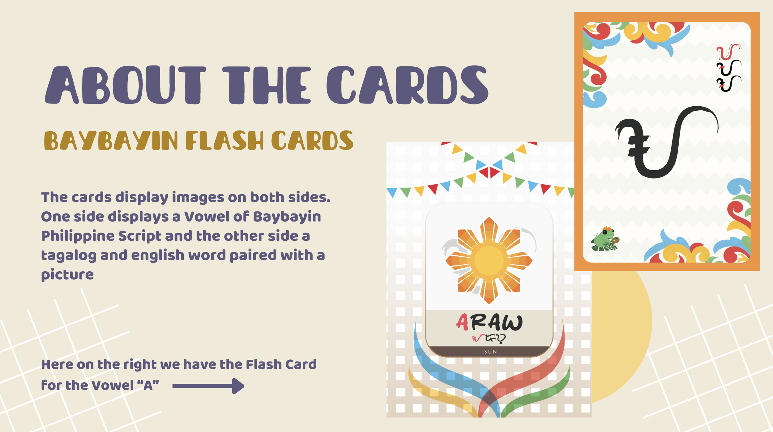 “Baybayin Flashcards are a physical medium that creates an educational tool from years of history, through visual artistry and combining the pre-colonial writing systems that we don’t use on a day-to-day basis.”